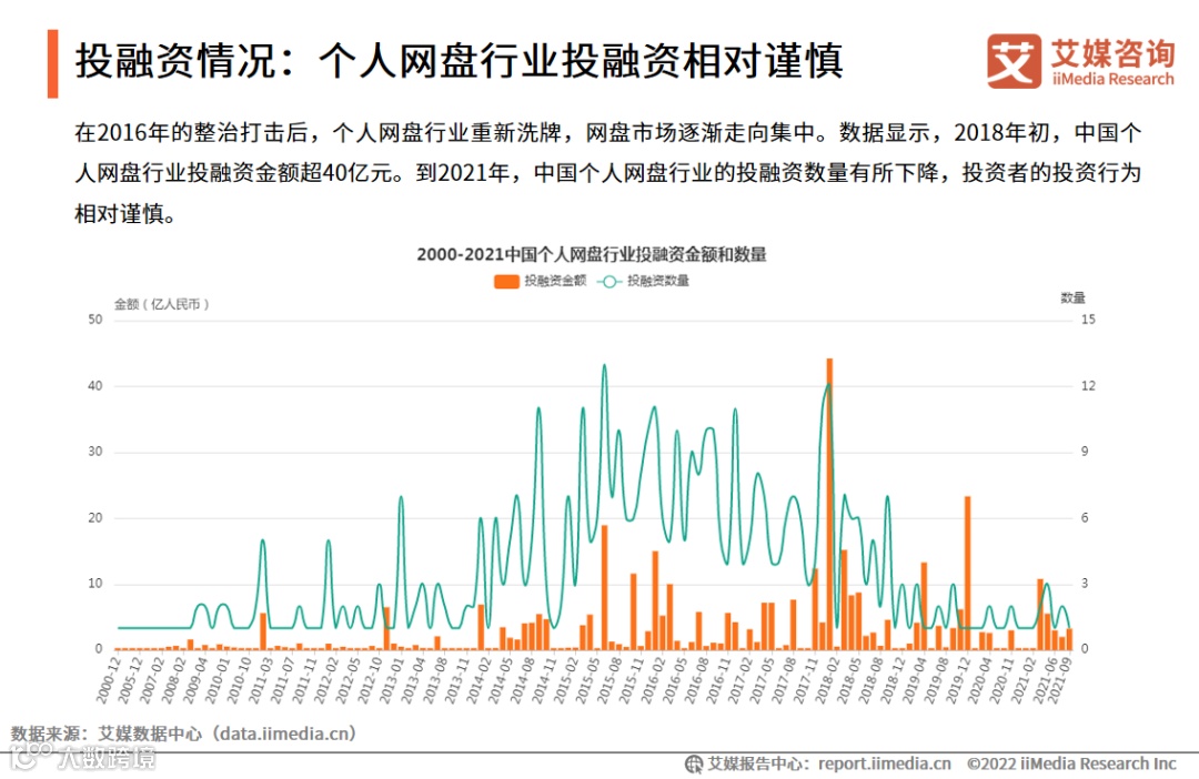 在2016年的整治打击后,个人网盘行业重新洗牌,网盘市场逐渐走向集中。数据显示,2018年初,中国个人网盘行业投融资金额超40亿元。到2021年,中国个人网盘行业的投融资数量有所下降,投资者的投资行为相对谨慎。