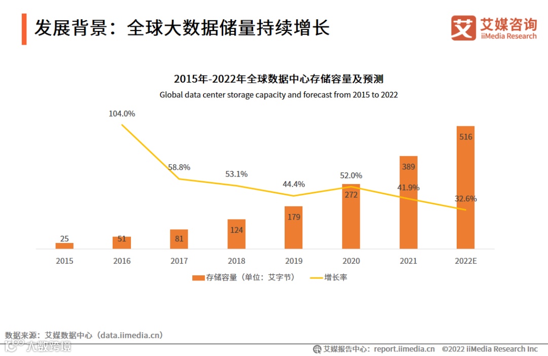 数据显示,从2015至2021年,全球数据中心存储容量呈现上升趋势,预计2022年达到516艾字节。