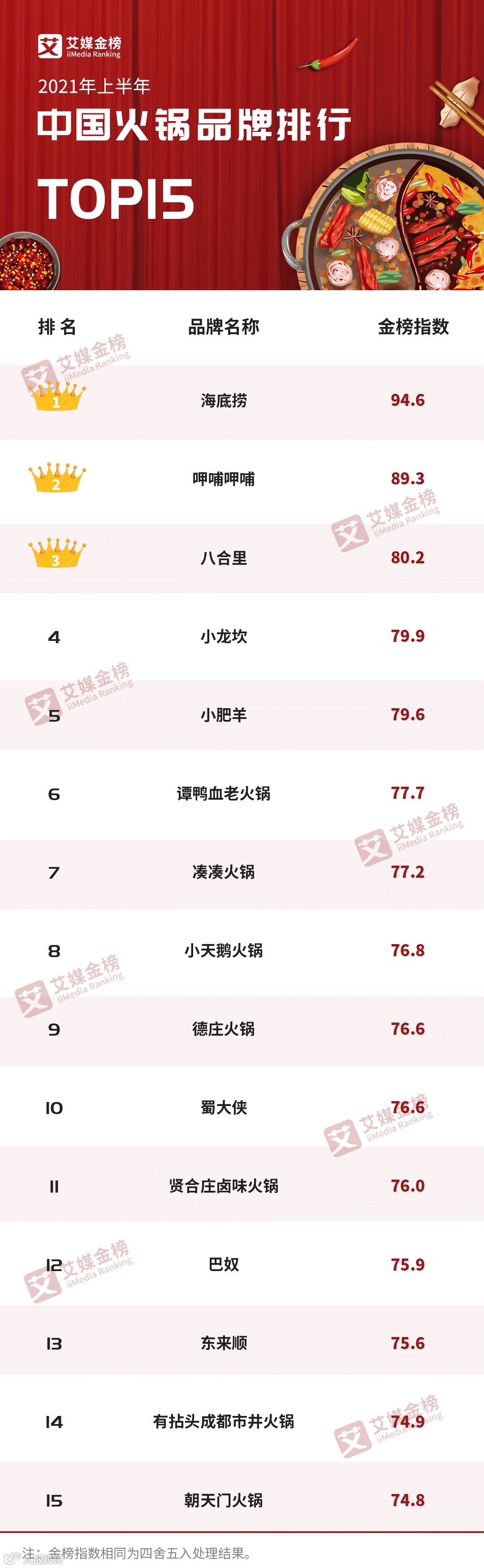本次上榜《2021年上半年中国火锅品牌排行Top15》的品牌有海底捞、呷哺呷哺、八合里、小龙坎、小肥羊、谭鸭血老火锅、凑凑火锅、小天鹅火锅、德庄火锅、蜀大侠、贤合庄卤味火锅、巴奴、东来顺、有拈头成都市井火锅和朝天门火锅。其中,海底捞以94.6的金榜指数摘得桂冠,呷哺呷哺、八合里分别以89.3、80.2的金榜指数位列第二名、第三名。