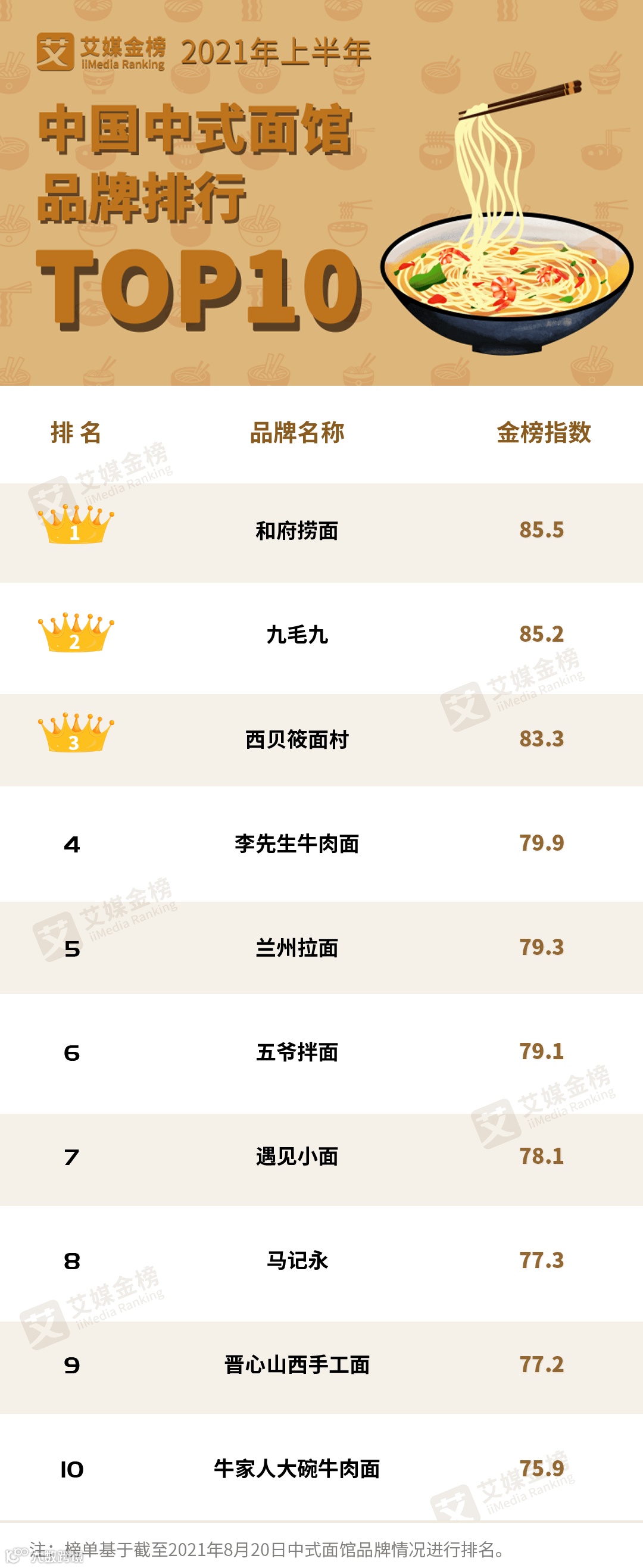 本次上榜《2021年上半年中国中式面馆品牌排行Top10》的品牌有和府捞面、九毛九、西贝筱面村、李先生牛肉面、兰州拉面、五爷拌面、遇见小面、马记永、晋心山西手工面和牛家人大碗牛肉面。其中,和府捞面以85.5的金榜指数摘得桂冠,九毛九、西贝筱面村分别以85.2、83.3的金榜指数位列第二名、第三名。