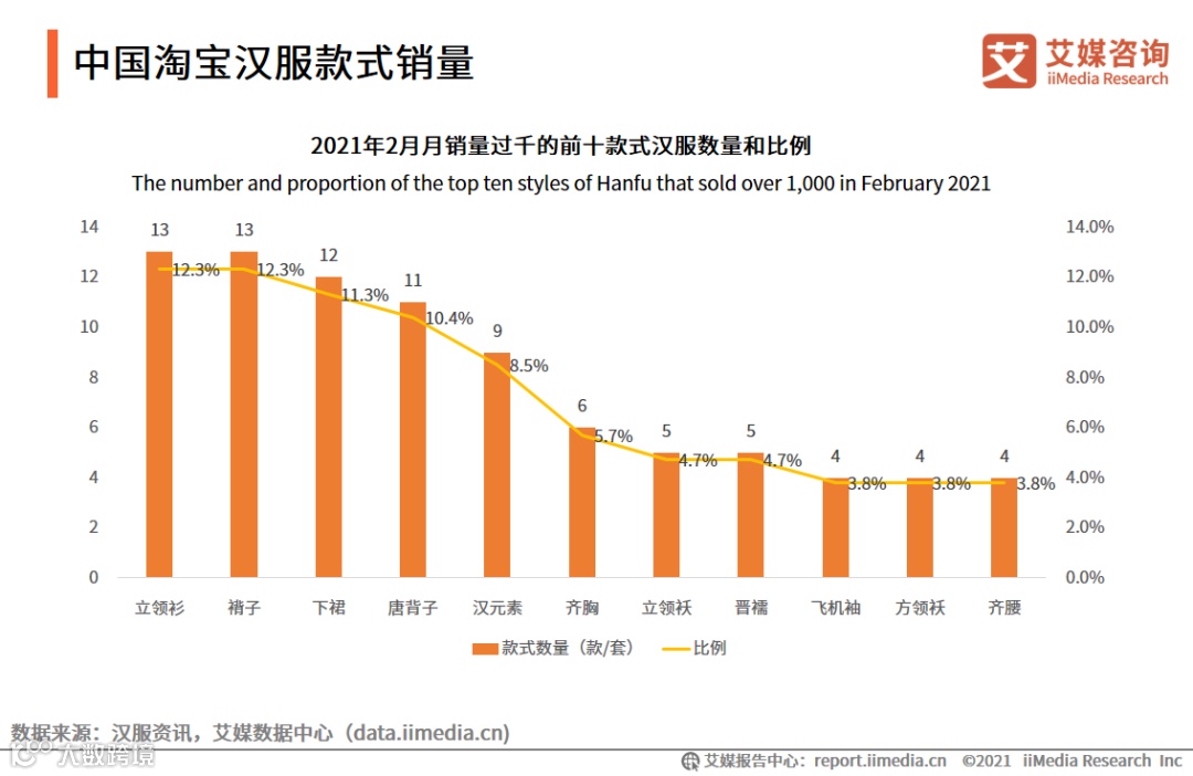数据统计显示,2021年2月月销量过千的产品分布于不同的款式,其中数量较多的款式分别是立领衫、褙子和下裙等,分别占比12.3%、12.3%和11.3%。