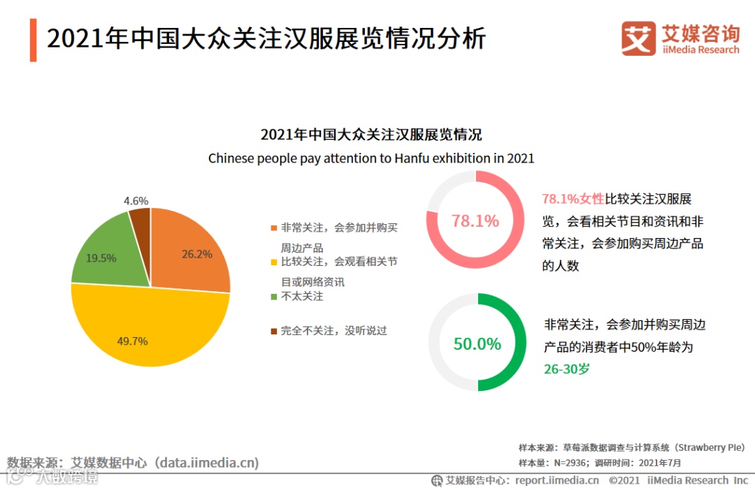 iiMedia Research(艾媒咨询)调研数据显示,接近50%的中国消费者有关注过汉服相关文化节或者展览,且有26.2%的人表示自己会参加并购买周边产品;从性别看,大多数女性较为关注汉服展览,而非常关注并会参加和购买周边的消费者50%年龄在26-30岁间。艾媒咨询分析师认为,数据表明中国大众对汉服展览关注度有待提升。