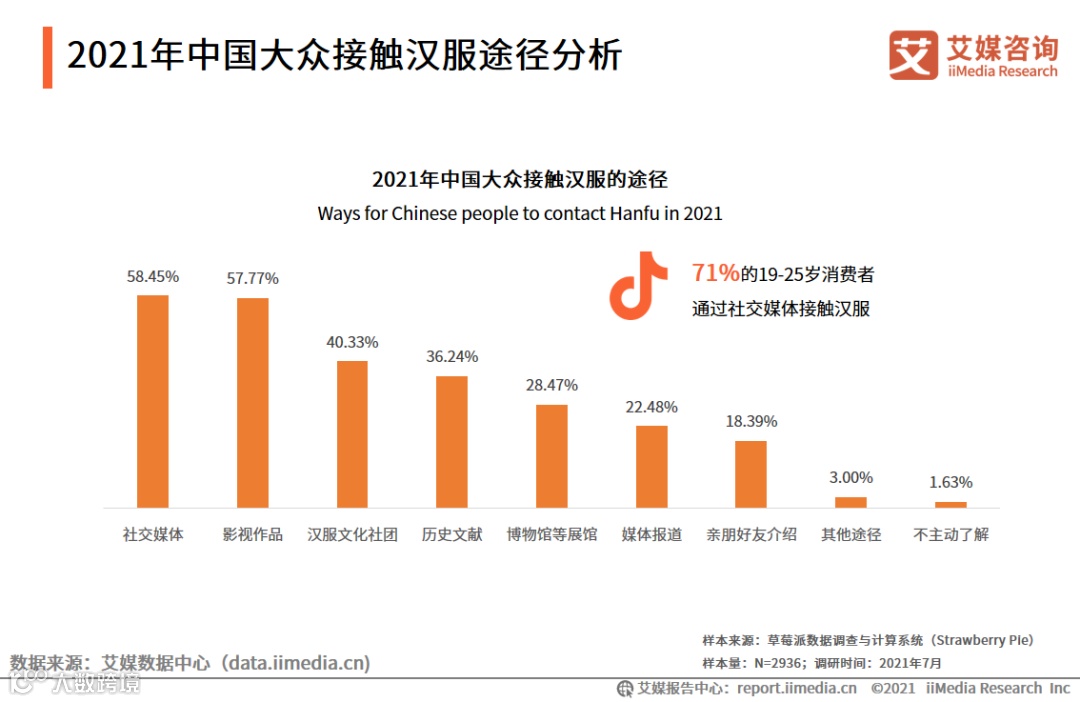 iiMedia Research(艾媒咨询)调研数据显示,中国大众对汉服的了解途径主要为社交媒体和影视作品。其次是汉服文化社团、历史文献、博物馆等,而19-25岁的年轻群体最为偏好通过社交媒体。艾媒咨询分析师认为,社交媒体特别是短视频平台以及古装题材的影视作品能够形象生动地展示汉服之美,是推动汉服走向大众化的重要途径。