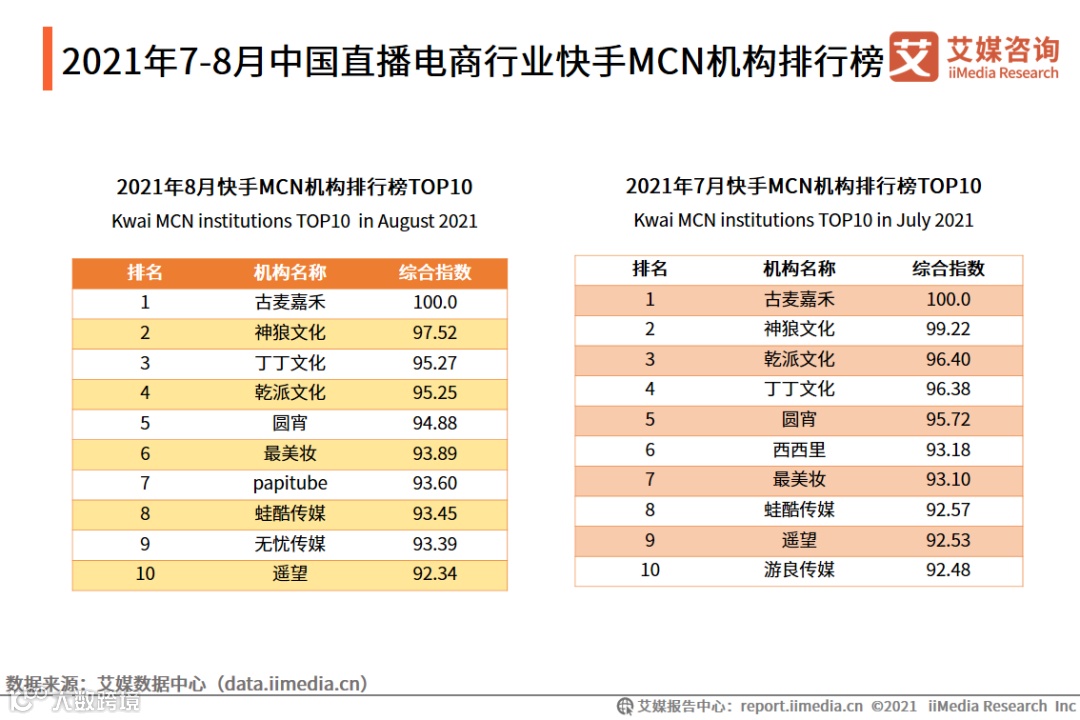2021年7-8月中国直播电商行业快手MCN机构排行榜