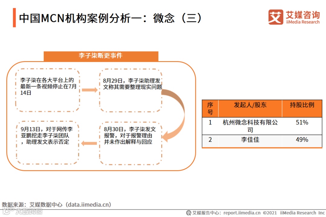 2017年,微念与李佳佳(化名:李子柒)的合作方式改为合资公司方式,二者共同设立四川子柒文化,从企查查看出,微念控股51%,李佳佳控股49%,实际控制权还是在杭州微念。艾媒咨询分析师认为,从某种程度上看,相较于李佳琦和美腕之间的关系,李子柒对于微念控股能力并不强。或许是因为如此,李子柒意识到双方合作的一些问题,引发了这次的新闻事件,并吸引了广大网友的关注。