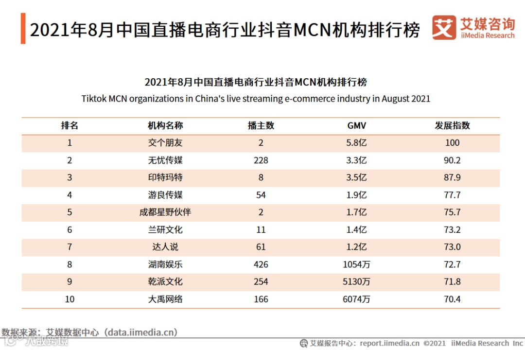 数据显示,2021年8月中国直播电商行业抖音MCN机构排行榜的前三名分别是交个朋友、无忧传媒和印特玛特,其中交个朋友GMV为5.8亿,无忧传媒3.3亿,印特玛特3.5亿。艾媒咨询分析师认为,交个朋友、无忧传媒和印特玛特的影响力保持良好,但同时其他MCN也在发力并不断完善自身体制,MCN机构之间的差距逐步缩小。