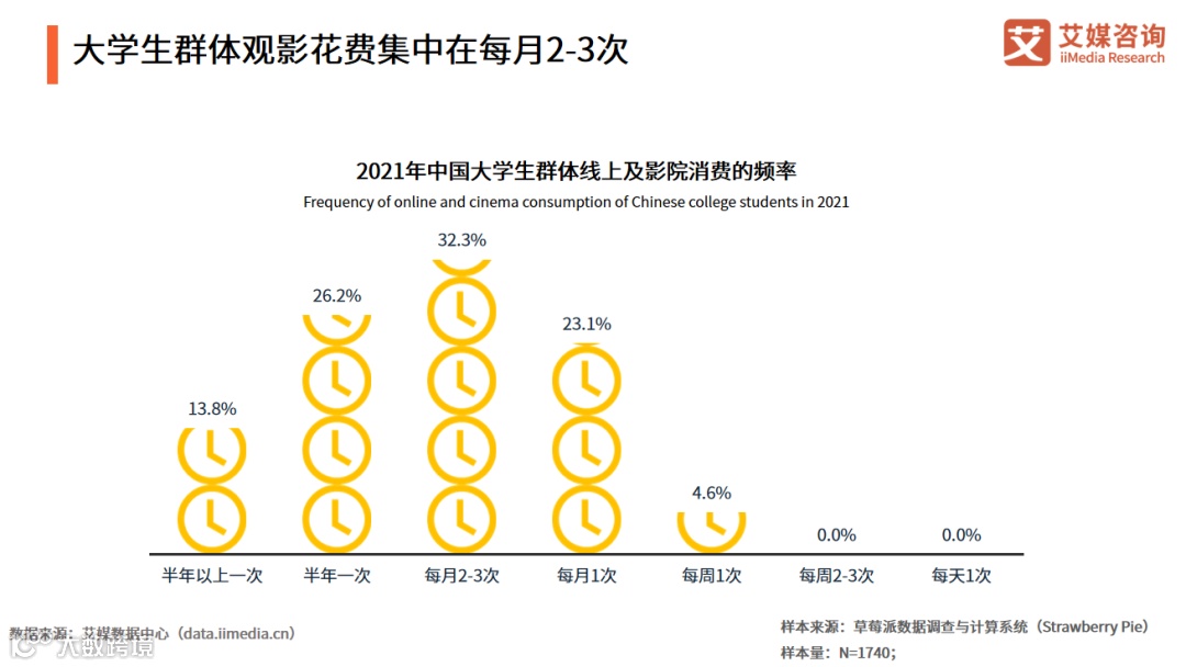 数据显示,大学生群体观影花费集中在每月2-3次左右,去影院观影成为大学生课余休闲时间一大选择。