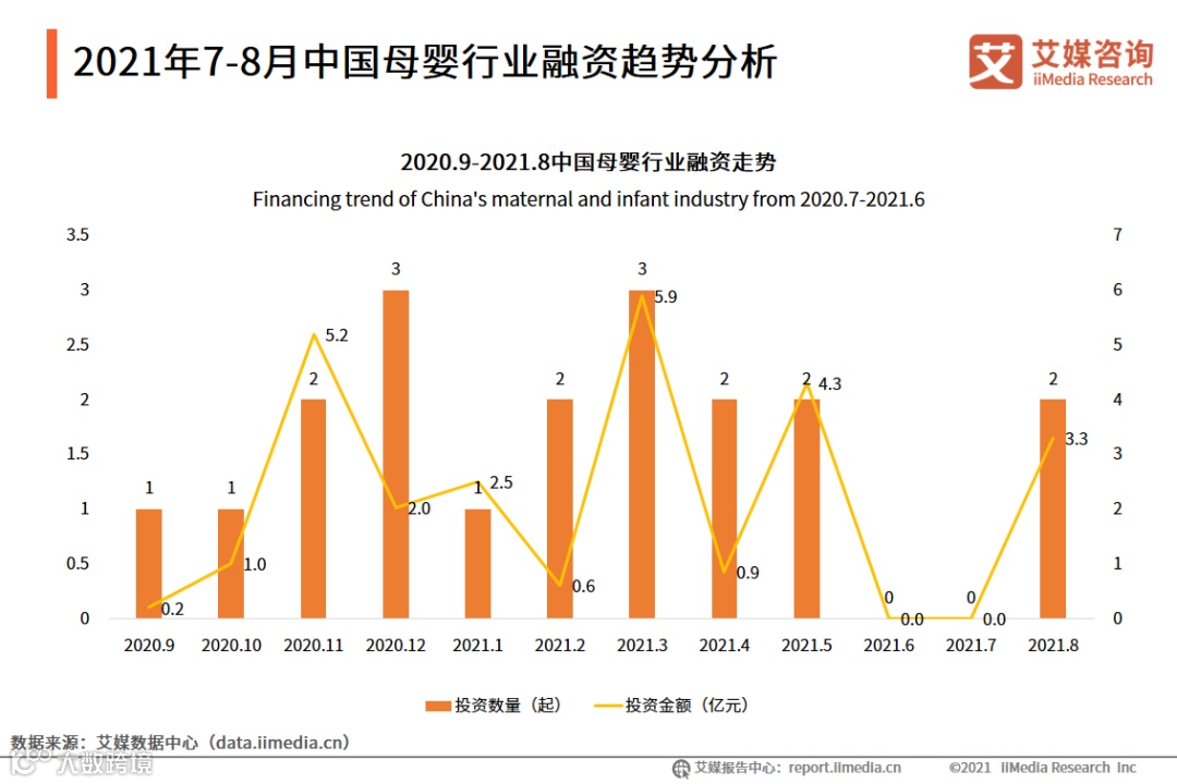 数据显示,2020年9月—2021年8月母婴行业共发生融资事件19件,融资金额为25.9亿元。其中7-8月发生两件融资事件,分别为怡禾健康和乐摇摇,共融资3.3亿元。艾媒咨询分析师认为,目前母婴行业上出现了许多细分领域,未来的母婴行业上的融资将以多元化为趋势。