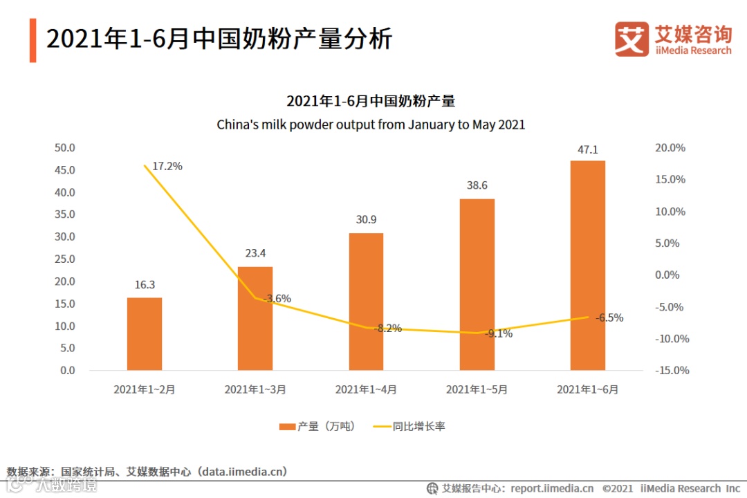 2021年1-6月中国国产奶粉产量下降、中国进口奶粉量增加,奶粉进口市场与内销市场经营状况形成反差。数据显示,2021年在国际奶粉价格在5月达到高峰后下滑。艾媒咨询分析师认为,随着国际奶粉价格的下降,中国2021年下半年进口奶粉量仍会增加,预计2021年中国进口奶粉将突破150万吨,创历史新高。