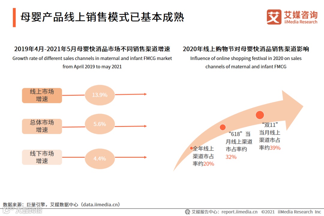数据显示,从中国母婴快消品市场线的销售市场状况来看,线下市场的总体占有率约为80%,近两年中国母婴快消品全渠道销售额平均增速为5.6%,线上渠道销售额增速为13.9%,线下增速为4.4%。线上销售渠道优势不断突出。在2020年的6月和11月,受“6.18”和“双11”的影响,母婴快消品的线上渠道销售额市占率分别从约20%提升至32%和39%。