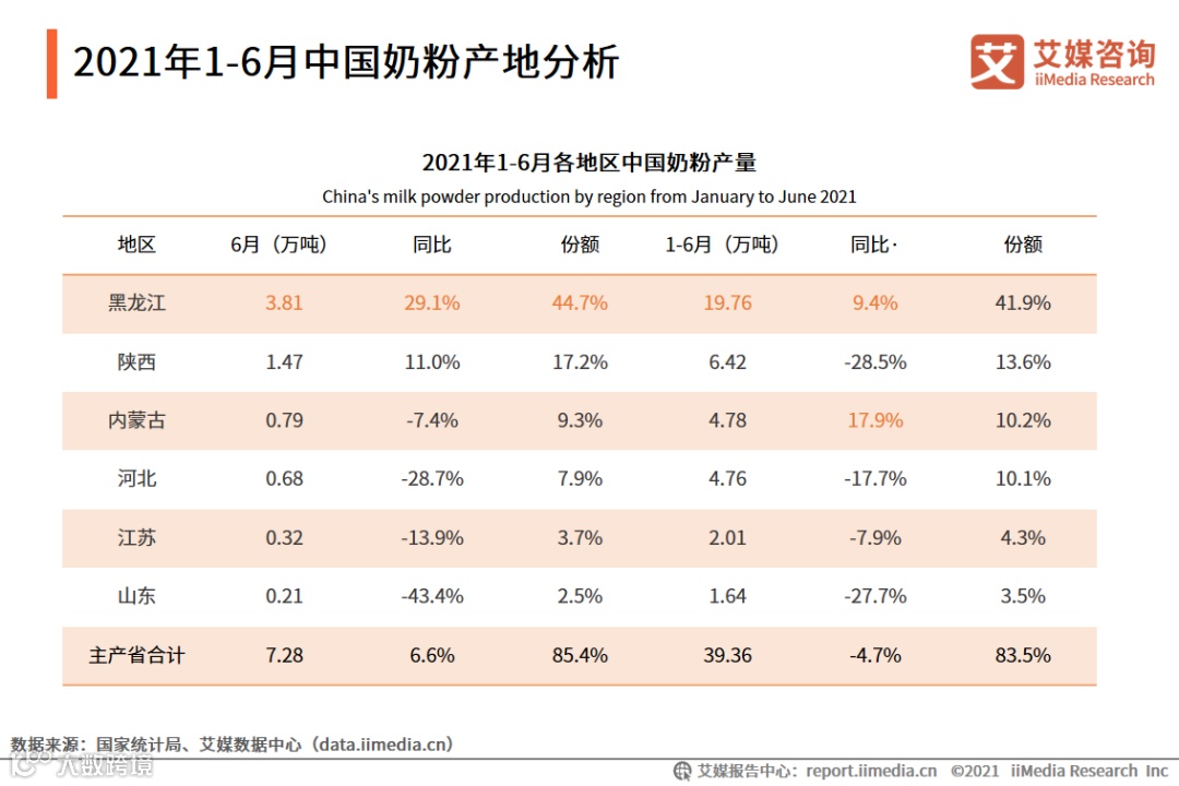 数据显示,上半年全国前六大奶粉生产省份合计生产39.36万吨奶粉,同比减少4.7%,六月生产7.28万吨奶粉,同比增加6.6%。其中,黑龙江6月生产3.81万吨奶粉,同比增长29.1%,占全国份额的44.7%。艾媒咨询分析师认为,黑龙江是中国重要的产奶粉省,由于地理位置等因素,其奶源品质也较高,黑龙江的奶业产业发展前景大。