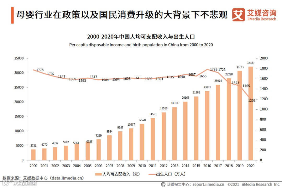 中国出生人口下降对中国母婴行业造成一定的负面影响是毋庸置疑的,但随着中国政府在生育支持政策上的大力推进,新生婴儿及其家庭在衣食住行教等方面的支持力度增加,出生人口数有望在2021年触底回升。另外,随着中国人均可支配收入的不断提高,人们对母婴产品的消费意识与过去相比已经出来了较大的变化,从过去的“能生下来就行”到现在的“生得好、养得好”的意识转变。从长期上看,消费升级的意识将持续在母婴行业流行,母婴行业未来仍有较大的发展趋势。