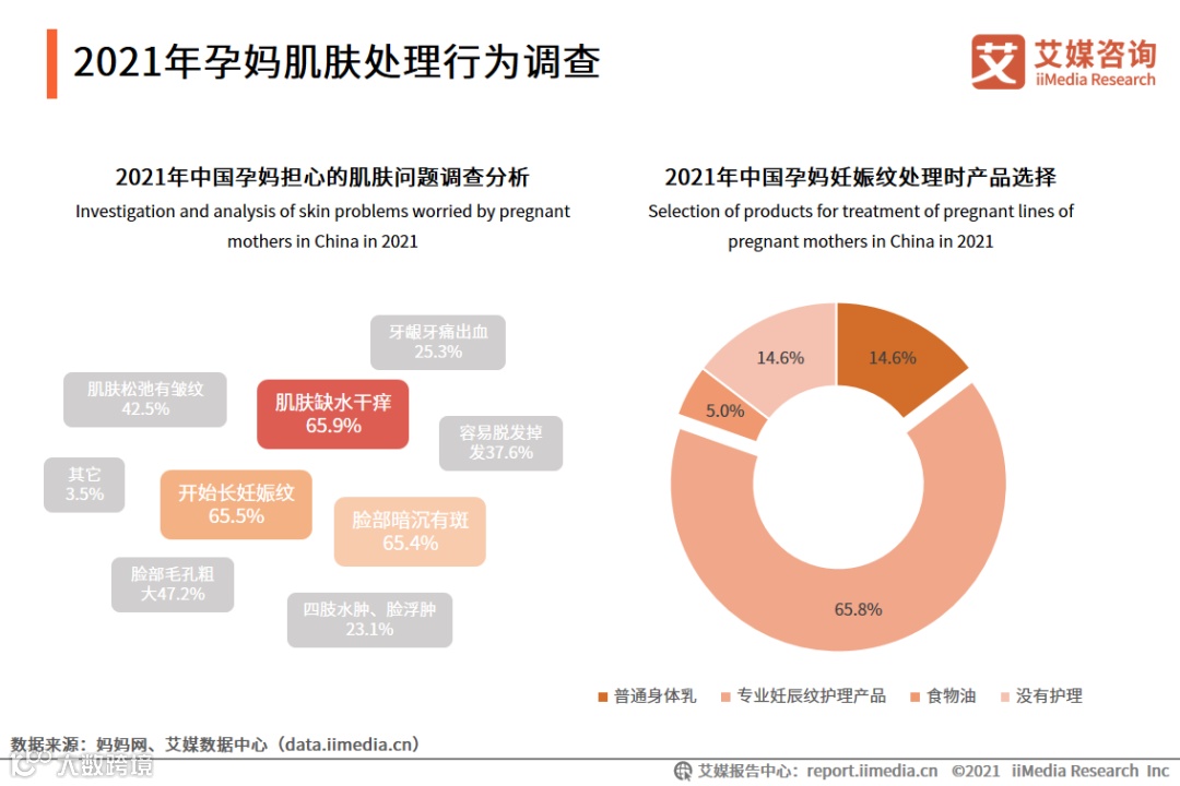 数据显示,中国孕妈在怀孕期间对多种肌肤问题表示担心,最担心的三类问题是肌肤缺水干痒、妊娠纹、脸部暗沉有斑。另外,在对妊娠纹的处理上,65.8%的孕妈都会使用专业的妊娠纹产品。