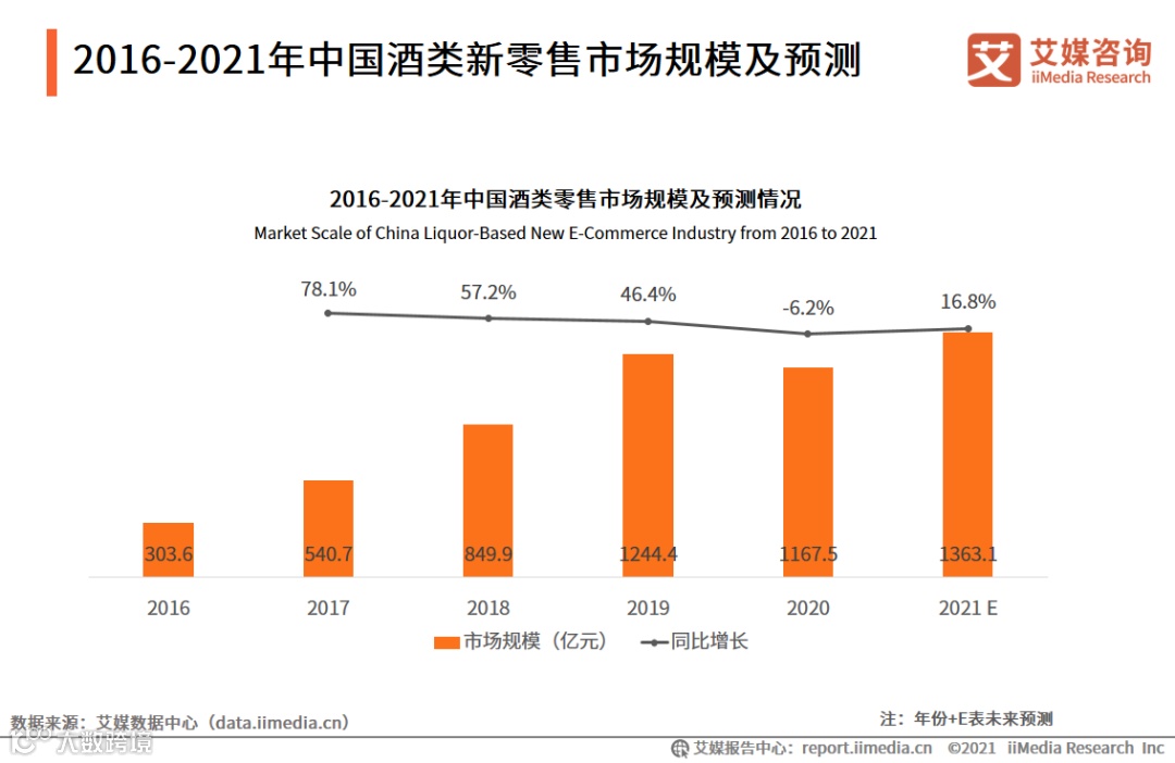 iiMedia Research(艾媒咨询)数据显示,2021年酒类新零售市场规模为1363.1亿元。艾媒咨询分析师认为, 数字化、AI、物联网技术逐渐成熟,中国酒类新零售渠道不断拓宽,运营效率不断提升,利好于行业整体发展。