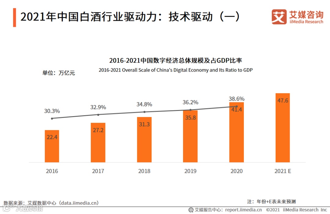 数据表明,2020年中国数字经济总体规模达41.4万亿元,占GDP比例为38.6%,预计2021年规模将达47.6万亿元。艾媒咨询分析师认为,中国数字经济已经成为驱动经济增长的重要力量,白酒企业结合数字化运营,在竞争激烈的市场中增强自身发展竞争力。