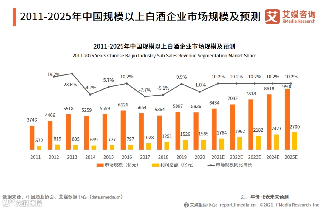 iiMedia Research(艾媒咨询)数据显示,2021年中国规模以上白酒企业市场规模将达6434亿元,同比增长10.2%。数字化技术赋能白酒行业,助力中国白酒企业实现降本增效的效果,预计未来行业发展稳定,市场整体将保持10.2%左右的增长率上升,2025年白酒销售收入将达9500亿元,利润将达2700亿元。