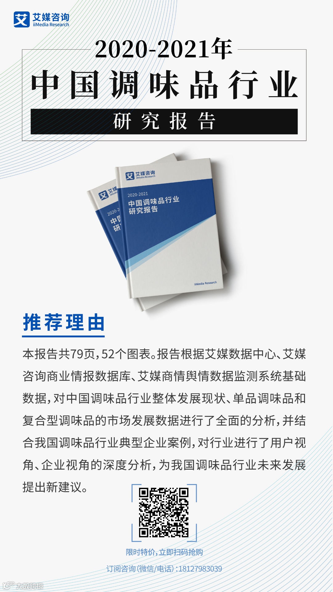 不过毫无疑问,复合调味料品正逐渐成为新一轮发展蓝海,如今,随着消费水平的提升以及消费观念的转变,越来越多年轻人依赖复合型调味品,用户规模持续扩大,调味品行业迎来巨大发展空间。对此,艾媒咨询发布了《2020-2021年中国调味品行业研究报告》,该行业报告对当前我国调味品整体市场发展概况、核心数据和市场竞争格局进行了全面分析,并且对相关用户的需求进行了深度调研,同时结合典型机构案例,提出了趋势预判。