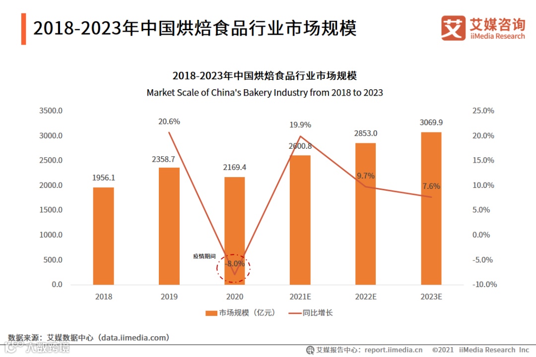 2021年中国烘焙食品行业市场规模将达2600.8亿元,同比增长19.9%。艾媒咨询分析师认为,随着疫情转好,市场规模将保持10%左右的增长率持续增长,2023年中国烘焙市场规模预计达到3069.9亿元。