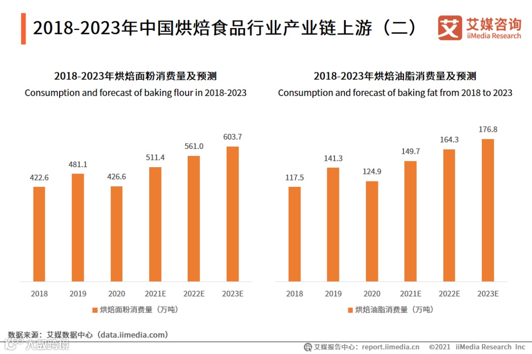 烘焙食品行业面粉和油脂的消耗量较多,2020年中国烘焙面粉消费量为426.6万吨,中国烘焙油脂消费量为124.9万吨。艾媒咨询分析师认为,烘焙食品市场规模持续扩容,对原材料面粉和油脂的需求量将持续增长。