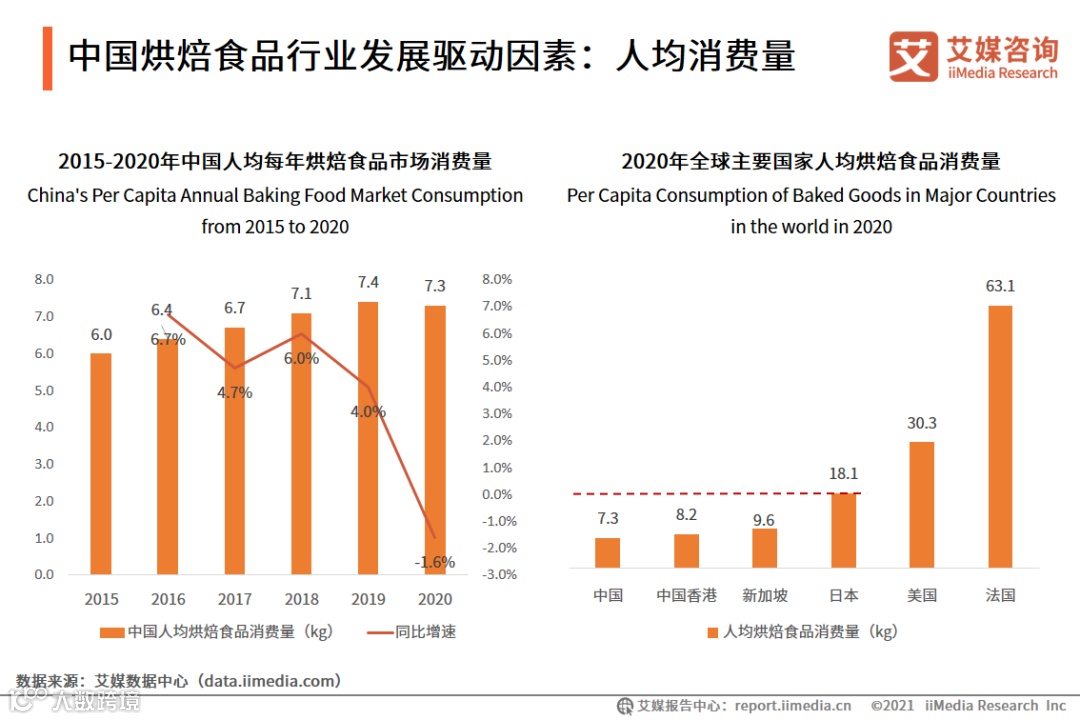 2020年中国人均烘焙食品消费量受到疫情影响增速略有下滑,人均消费7.3公斤。人均消费量与全球主要国家对比,不及饮食结构相同国日本的一半。艾媒咨询分析师认为,我国正处于消费升级阶段,人均消费水平呈上升趋势,我国烘焙食品行业人均消费量有望持续上升。