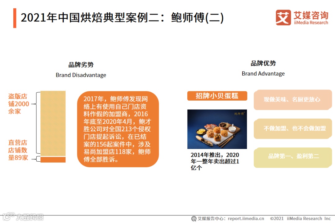 创业初期鲍师傅品牌保护意识较弱,2019年鲍师傅糕点共有89家直营店,而山寨的门店在最多的时候达到2000余家。鲍师傅的优势在于为了保持每家门店的产品品质,鲍师傅坚持糕点现做现卖、不做加盟、品牌第一,保证了食材统一、制作流程统一、产品新鲜,产品口味和品质得到了极大的保障,其招牌小贝蛋糕2020年卖出1亿个。艾媒咨询分析师认为,创业者应加强专利保护意识,在创业前期做好商标和品牌保护工作,利用好法律知识保护好知识产权。