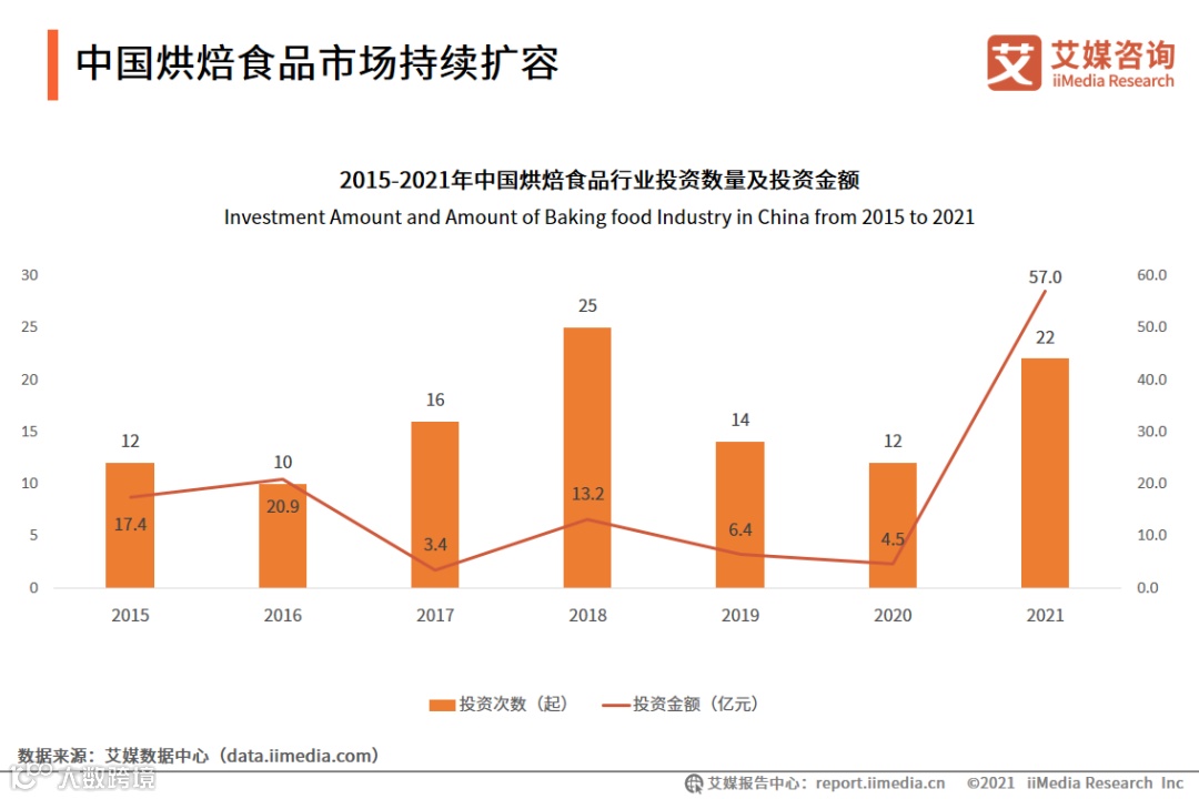 图表28. 2015-2021年中国烘焙食品行业投资数量及投资金额