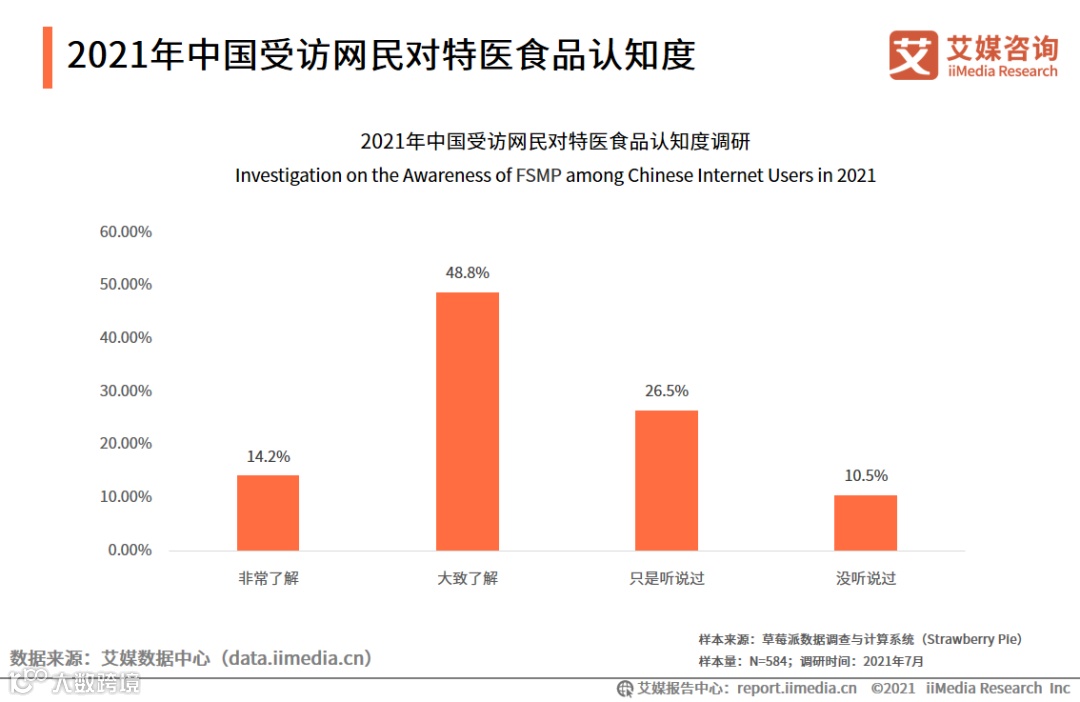 iiMedia Research(艾媒咨询)调研数据显示,14.2%的受访者表示对特医食品非常了解,48.8%的表示大致了解,此外剩下的37%的受访者对特医食品的认知度较低。艾媒咨询分析师认为,由于特医食品在国内发展的历史较短,且该产品需要在医生或临床营养师指导下使用,因而社会认知度会受到一定的限制。