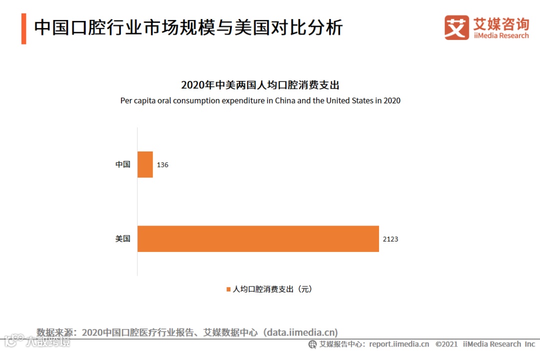 数据显示,2020年中国人均口腔消费支出仅136元,不足美国的十分之一。艾媒咨询分析师认为,我国有着庞大的人口基数,人民生活水平也日渐提高,因此会催生大量口腔消费的需求,所以我国口腔行业仍有非常大的增长空间。