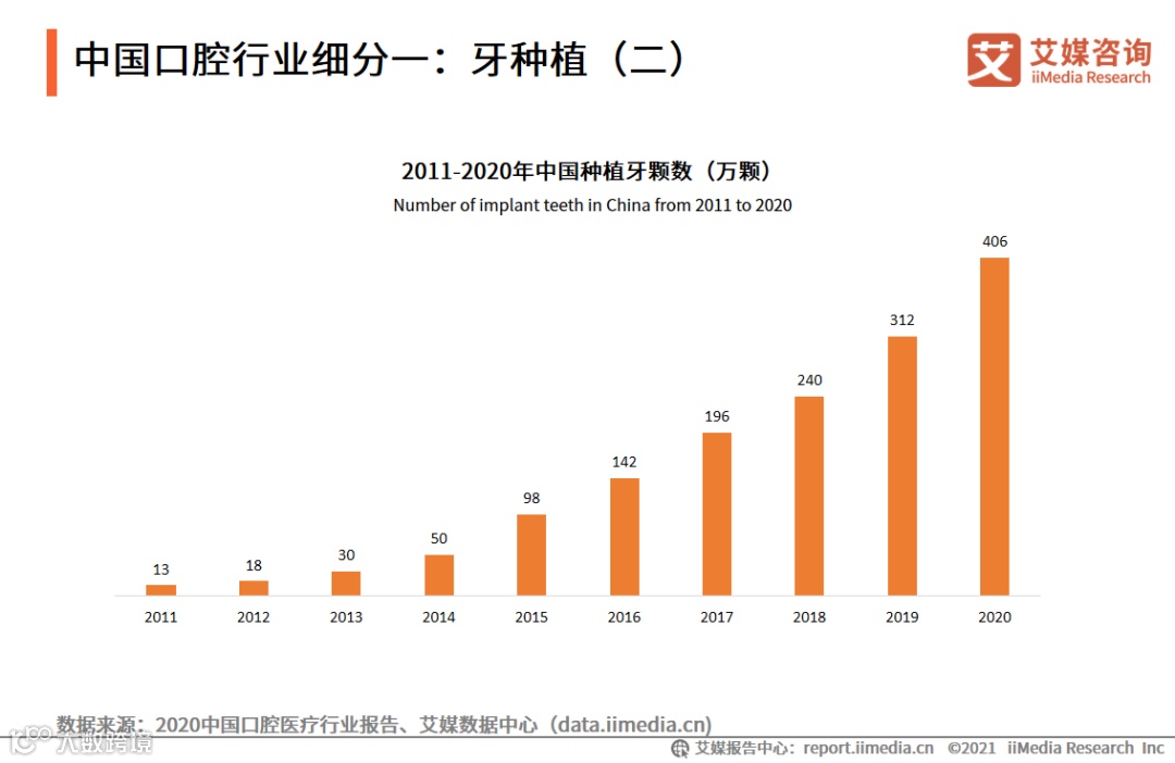 数据显示,从2011年到2020年,中国种植牙颗数飞速上涨,从2011年的13万颗增长到2020年的406万颗,复合增长率140.6%。中国种植牙市场的潜力得到了逐步释放。艾媒咨询分析师认为,逐年提升的种植牙颗数背后体现的是国民整体消费水平的提高以及对种植牙行业的接纳程度的提升。
