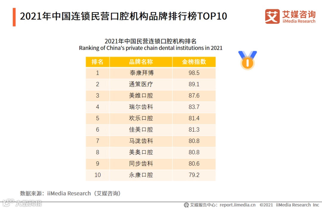 艾媒金榜(iiMedia Ranking)发布了《2021年中国连锁民营口腔机构品牌排行榜TOP20》榜单,泰康拜博、通策医疗、美维口腔、瑞尔齿科、欢乐口腔、佳美口腔、马泷齿科、美奥口腔、同步齿科、永康口腔借综合实力成功跻身榜单前十。