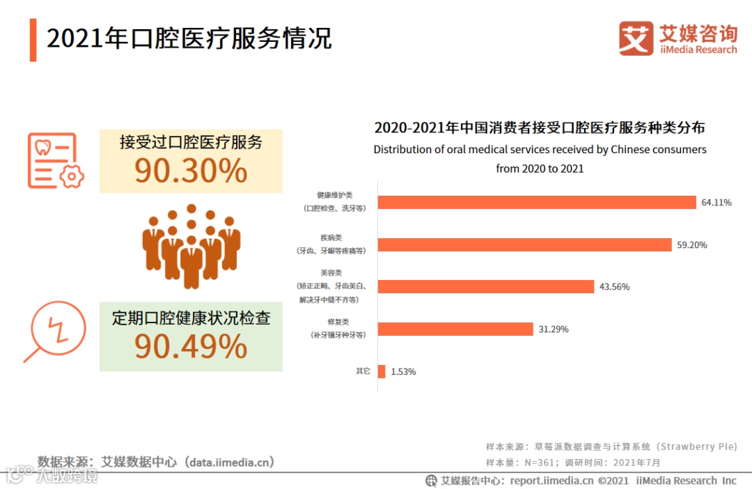 随着小康社会的全面建成,中国消费者将更多的注意力转移到身体与精神健康方面,iiMedia Research(艾媒咨询)数据显示,有90.30%的人接受过口腔医疗服务,并有超过九成的消费者会定期进行口腔健康状况检查;2020-2021年有64.11%的消费者接受过健康维护类的口腔医疗服务,其次是疾病类(59.20%)、美容类(43.56%)。艾媒咨询师认为,这不仅是生活水平提高的体现,也是口腔医疗健康逐渐普及的成果。