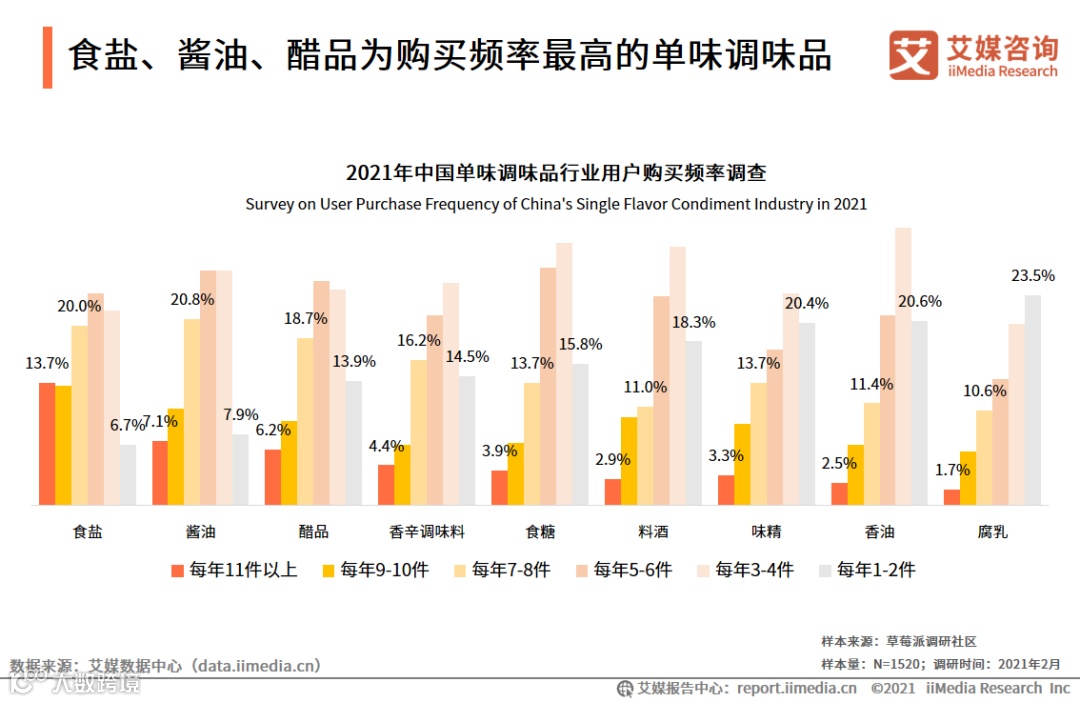 iiMedia Research(艾媒咨询)数据显示,作为单味调味品,食盐、酱油、醋品及香辛调味料的购买频率较高;相比较而言,香油、腐乳等调味品购买频率较低。