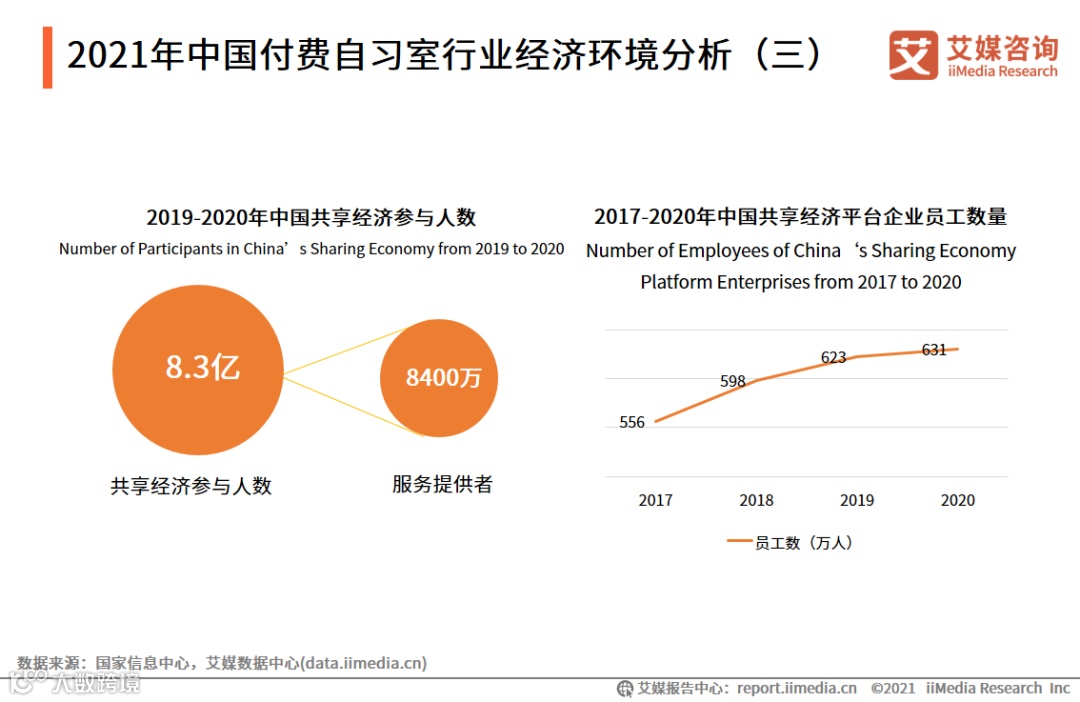 数据显示,2020年中国共享经济参与人数为8.3亿元,服务提供者人数为8400万,共享经济平台员工数量持续上升,共享经济行业劳动力供给的增长也为付费自习室行业发展提供充足的人力资源供给。