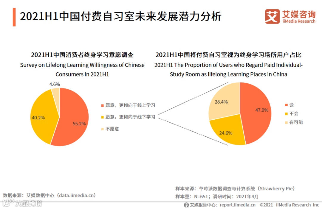 数据显示,超过9成的受访消费者有终身学习的意愿,有40.2%倾向于线下学习,其中,有47.0%的消费者表示会将付费自习室作为终身学习的场所,但也有24.6%的消费者明确表示“不会”,并有28.4%态度不明确。艾媒咨询分析师认为,消费者终身学习的需求将会推动付费自习室市场的发展。