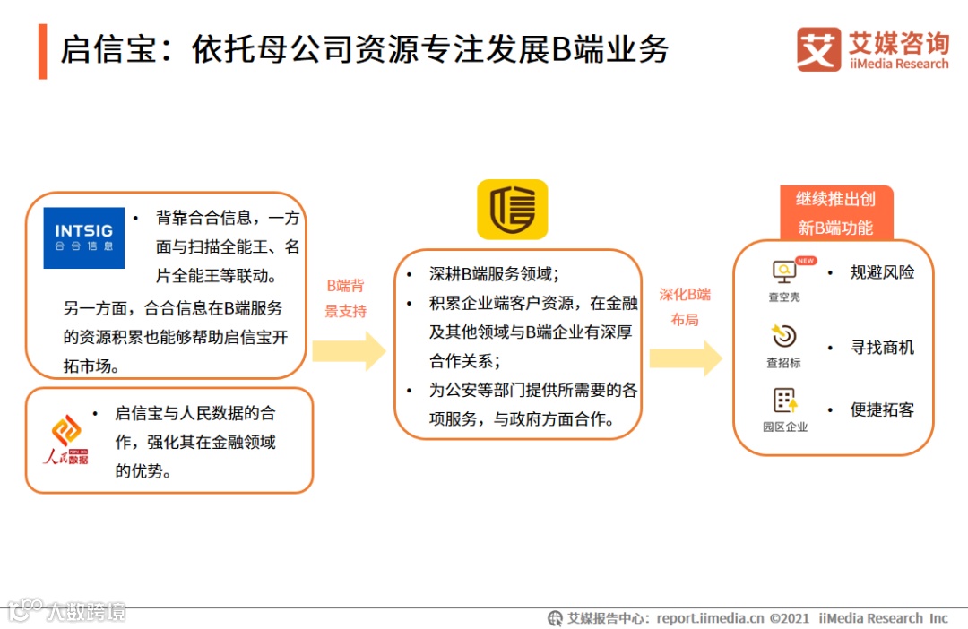 艾媒咨询分析师认为,启信宝在发展重心在B端业务,其母公司合合信息在B端市场沉积深厚,加上与人民数据的合作,平台在企业端和政府端的业务存在发展机会。但相较于天眼查和企查查,启信宝在C端用户市场的发展逐渐被抛开,C端流量的流失也使其未来发展存在不确定性。