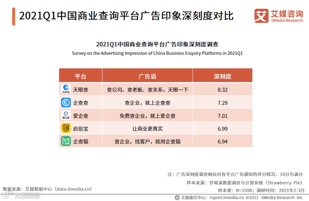 艾媒咨询分析师认为,中国商业查询行业激烈的竞争环境下,各大平台也通过加大广告投放力度来提升品牌的认知度。其中天眼查的“三查”广告语能较好表达平台服务类型,而“天眼一下”则加深了广告语的品牌记忆点。另一方面,天眼查品牌代言人吴刚与平台属性契合度高,传播效果较好,使得天眼查的广告在受访网民中印象深刻度最高。