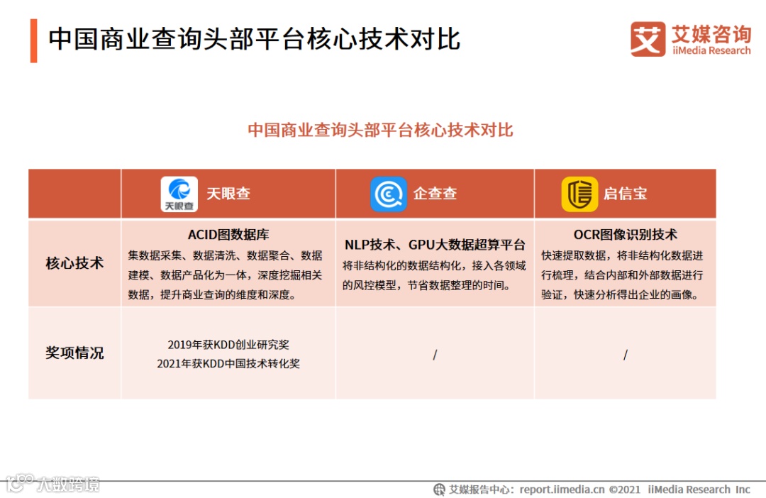 数据规模海量、数据类型多样的特点让各商业查询平台对于数据的查询、分析与数据建模技术有了更高的要求。目前来说,中国商业查询头部平台都逐渐拥有了自己的核心技术,如天眼查自主研发的ACID图数据库、企查查的GPU大数据超算平台。