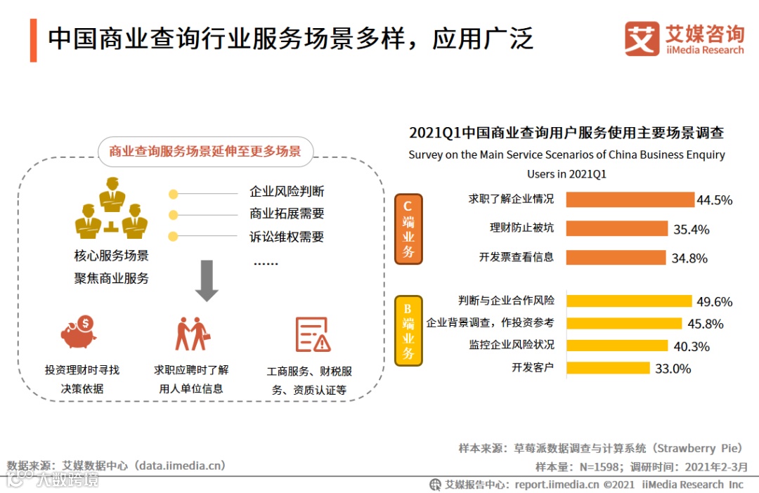 最初用户对于商业查询服务的核心使用诉求集中在商业服务场景,需求主要是为企业商业行为的开展进行风险判断。但随着商业查询平台对C端用户群体的覆盖扩大,个人用户使用需求特点更加多样化,商业查询服务的场景也得以进一步延伸。iiMedia Research(艾媒咨询)数据显示,除了判断企业合作风险(49.6%)、投资参考(45.8%)等商业化用途有较多使用外,求职、理财、消费等出于个人需求而使用的场景也逐渐占据更加重要的地位。