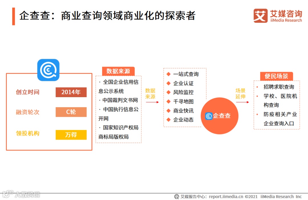 企查查是中国国内最早成立的一批商业查询平台之一,前身为微信版“企业信用信息查询”。除了入局市场,企查查也是行业内较早获取投融资和进行商业化探索的平台。目前企查查平台聚合的功能呈现多样化特点,覆盖的便民场景不断延伸。同时,企查查与C轮投资方万得与兴富资本打造“数据雨林”计划,共同构建大数据行业生态系统。