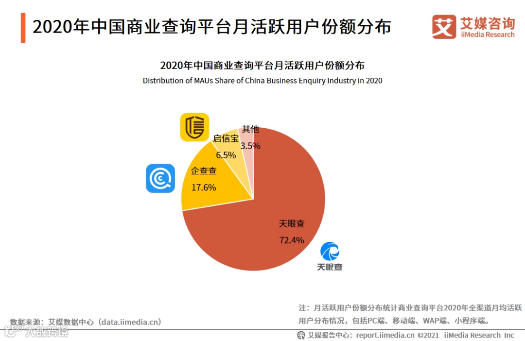 iiMedia Research(艾媒咨询)数据显示,商业查询平台中,天眼查占据72.4%的活跃用户份额,企查查则以17.6%的份额占比排名次席。艾媒咨询分析师认为,天眼查、企查查、启信宝作为中国商业查询行业的三家先入市场的公司,积累有广泛的用户基础。其中,天眼查凭借广告营销建立起品牌认知,并通过技术优势对商业数据进行准确描述和挖掘,用户留存较高且容易形成口碑传播,头部优势明显。数据显示,2020年天眼查的全域用户规模已超过3亿。