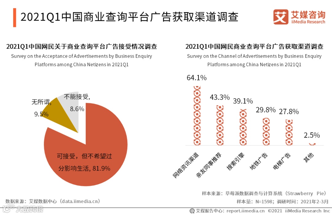 iiMedia Research(艾媒咨询)数据显示,目前受访网民对于商业查询平台投放广告的接受程度较高,占比超八成。而网络资讯渠道和亲友同事推荐是网民获取商业查询平台广告资讯的主要渠道。艾媒咨询分析师认为,商业查询平台的传播除了广告营销外,同事、朋友之间的社群传播也是另一个重要途径,平台需要不断提升优化服务质量和服务水平,提升用户口碑以获得更强的市场竞争力。