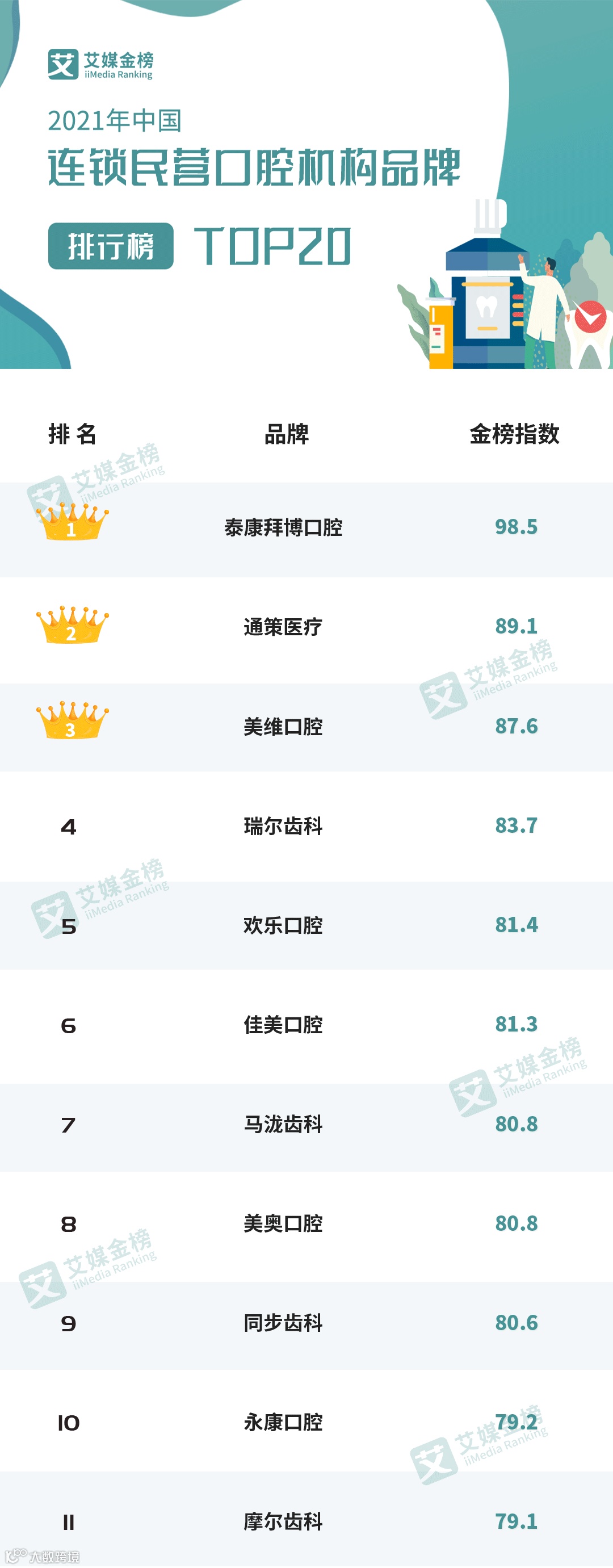 本次《2021中国连锁民营口腔机构品牌排行榜TOP20》中,泰康拜博口腔以98.5的金榜指数占据榜首,通策医疗与美维口腔分别以89.1和87.6的金榜指数位列第二、三名。其中,泰康拜博口腔在中国近50城布局近200家连锁店,有着较长的经营历史,深受消费者信任。