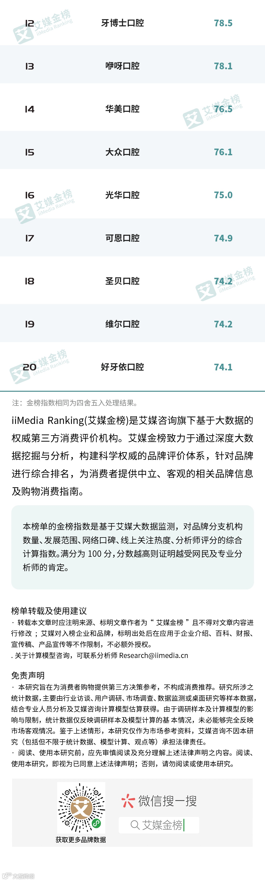iiMedia Ranking艾媒金榜最新发布《2021中国连锁民营口腔机构品牌排行榜TOP20》,对当前中国口腔机构品牌进行排名。本榜单的金榜指数是基于艾媒大数据监测,对品牌分支机构数量、发展范围、网络口碑、线上关注热度、分析师评分的综合计算指数。满分为100分,分数越高则证明越受网民及专业分析师的肯定。