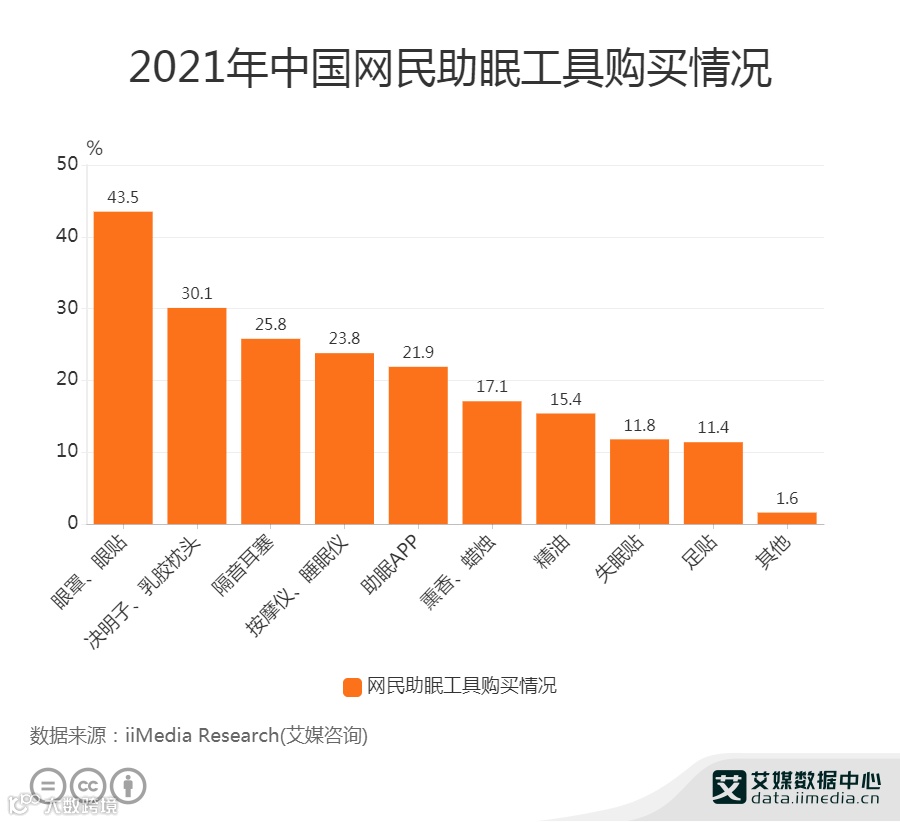 失眠发生率高企,众多失眠人群尝试助眠工具。从2021年中国网民助眠工具购买情况来看,43.5%网民购买眼罩、眼贴;30.1%网民购买决明子、乳胶枕头;25.8%网民选择购买隔音耳塞。