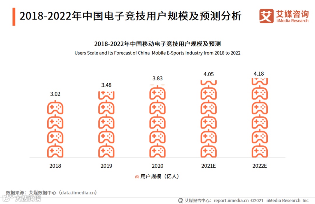 iiMedia Research(艾媒咨询)数据显示,中国移动电竞用户规模逐年增长,在2020年已到达3.83亿人,预计在2022年将达4.18亿人。艾媒咨询分析师认为,2020年疫情的爆发是电子竞技用户规模大幅增长的一大原因,随着中国移动端游戏的职业化发展不断成熟,其用户规模将进一步扩大,移动电竞将成为电竞行业的重要增长点。