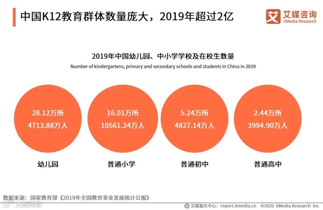 iiMedia Research(艾媒咨询)数据显示,2019年中国幼儿园28.12万所,在园幼儿4713.88万人;普通小学16.01万所,在校生10561.24万人;初中学校5.24万所,在校生4827.14万人;高中阶段教育共有学校2.44万所,在校学生3994.90万人。中国K12教育群体数量庞大,且覆盖范围广,对教育相关产品及服务存在较高的消费需求,为未来市场发展奠定了坚实的用户基础。