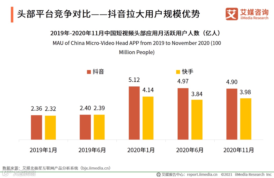 iiMedia Research(艾媒咨询)数据显示,抖音用户规模由2019年1月的2.36亿人增长至2020年11月的4.90亿人,同时与快手用户规模间的差距愈发明显。艾媒咨询分析师认为,抖音凭借内容分发和流量入口优势以及良好的海外发展势头后来居上,已逐渐确立短视频市场用户霸主地位。快手在用户方面虽然规模也快速增长,但是在与抖音的用户竞争中暂时处于下风,未来围绕用户流量的竞争仍是短视频行业的重点。