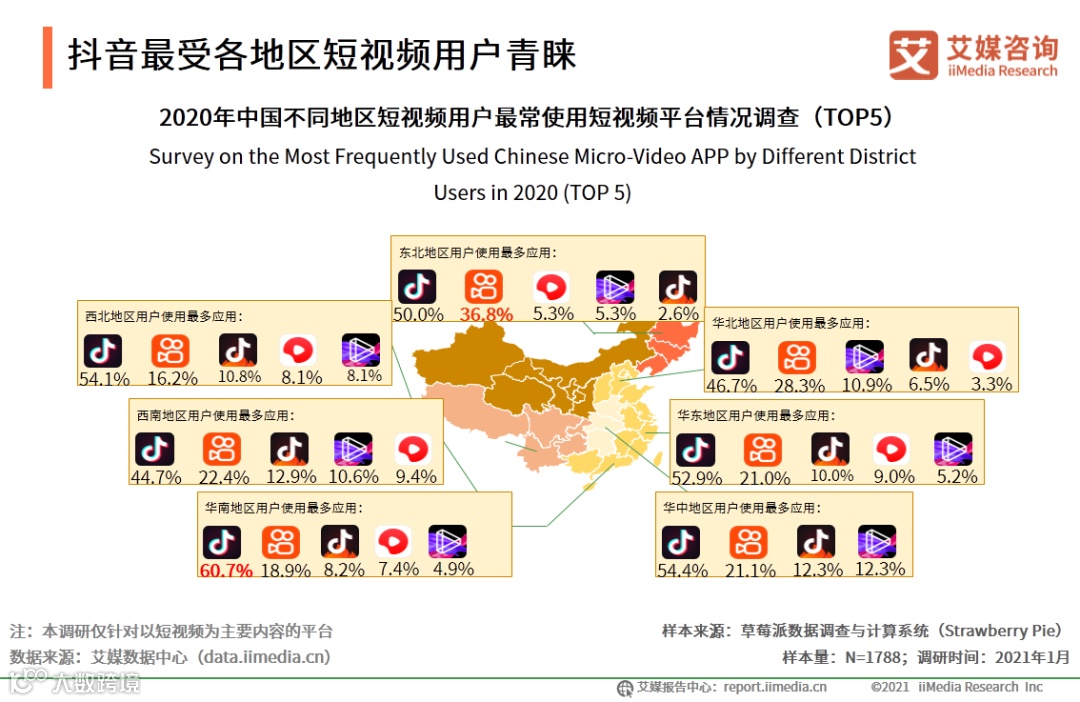 iiMedia Research(艾媒咨询)数据显示,2020年中国各个地区用户使用最多的短视频应用均为抖音,抖音使用率最高的地区是华南地区,快手使用率最高的地区是东北地区。艾媒咨询分析师认为,抖音在各地域市场均具有较高的用户偏好;快手在北方地区的市场基础相对更好,但也与抖音存在一定差距。