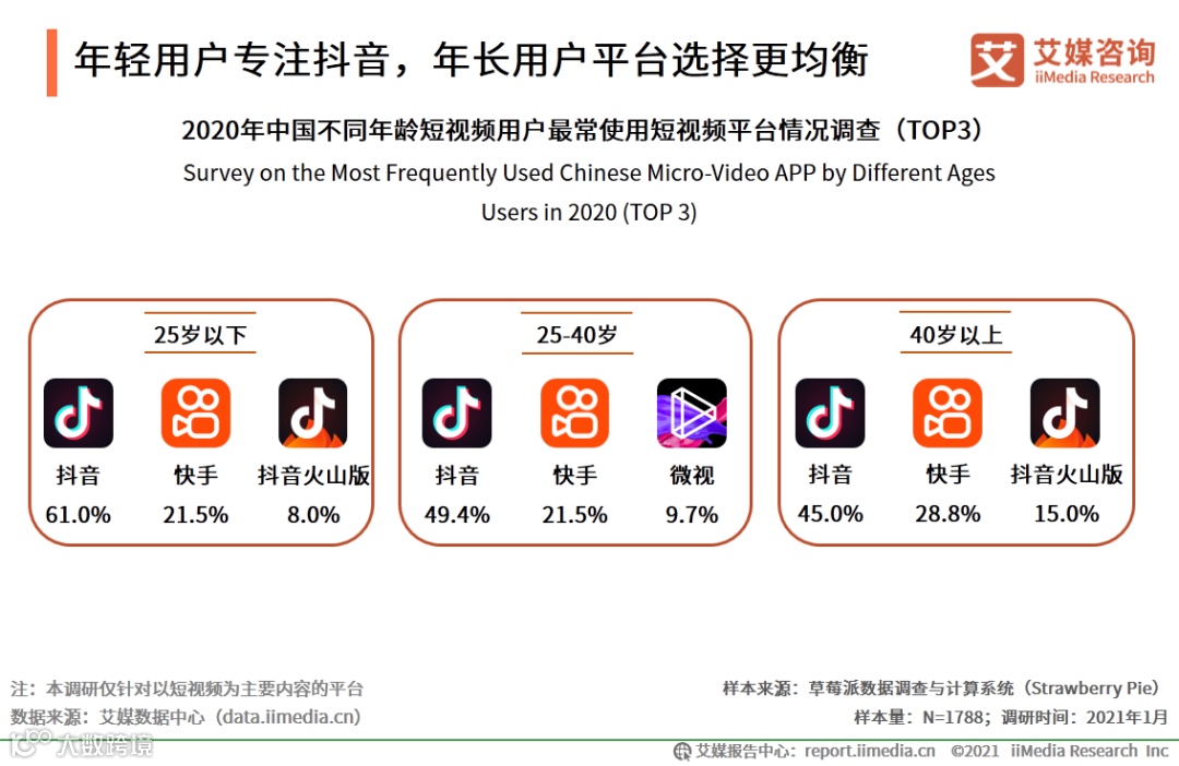 年轻用户专注抖音,年长用户平台选择更均衡