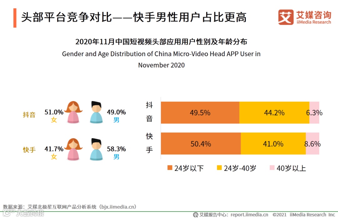 头部平台竞争对比——快手男性用户占比更高